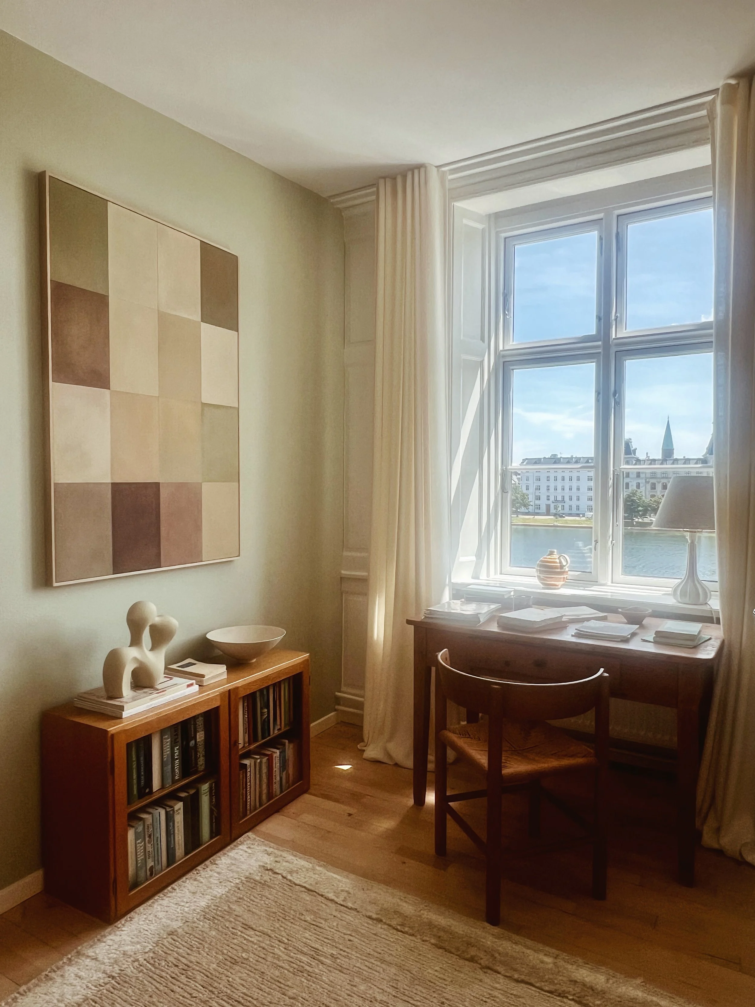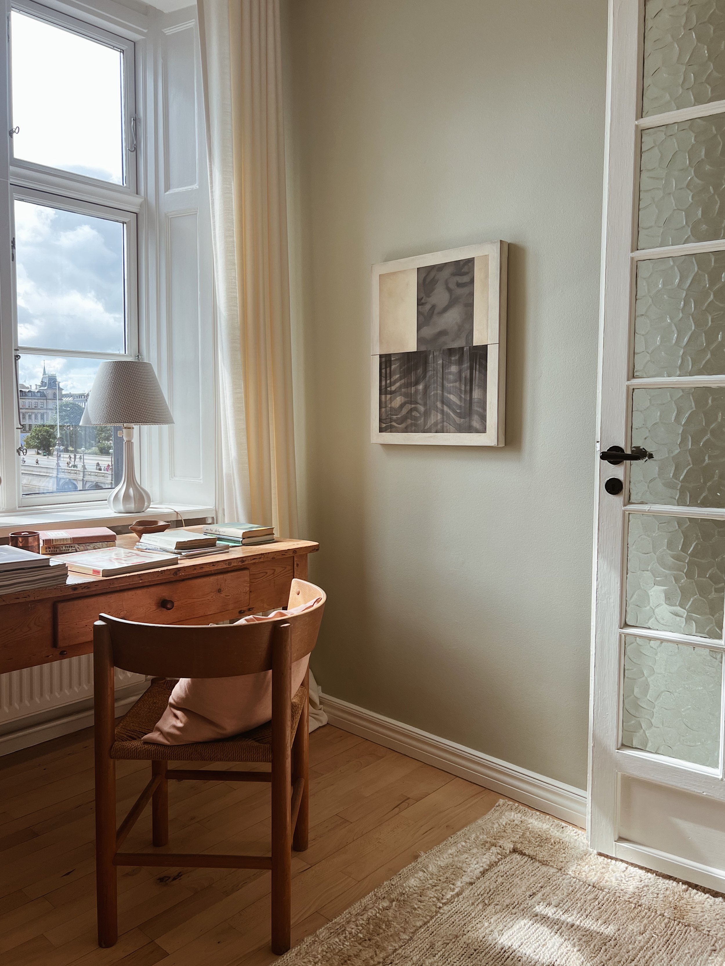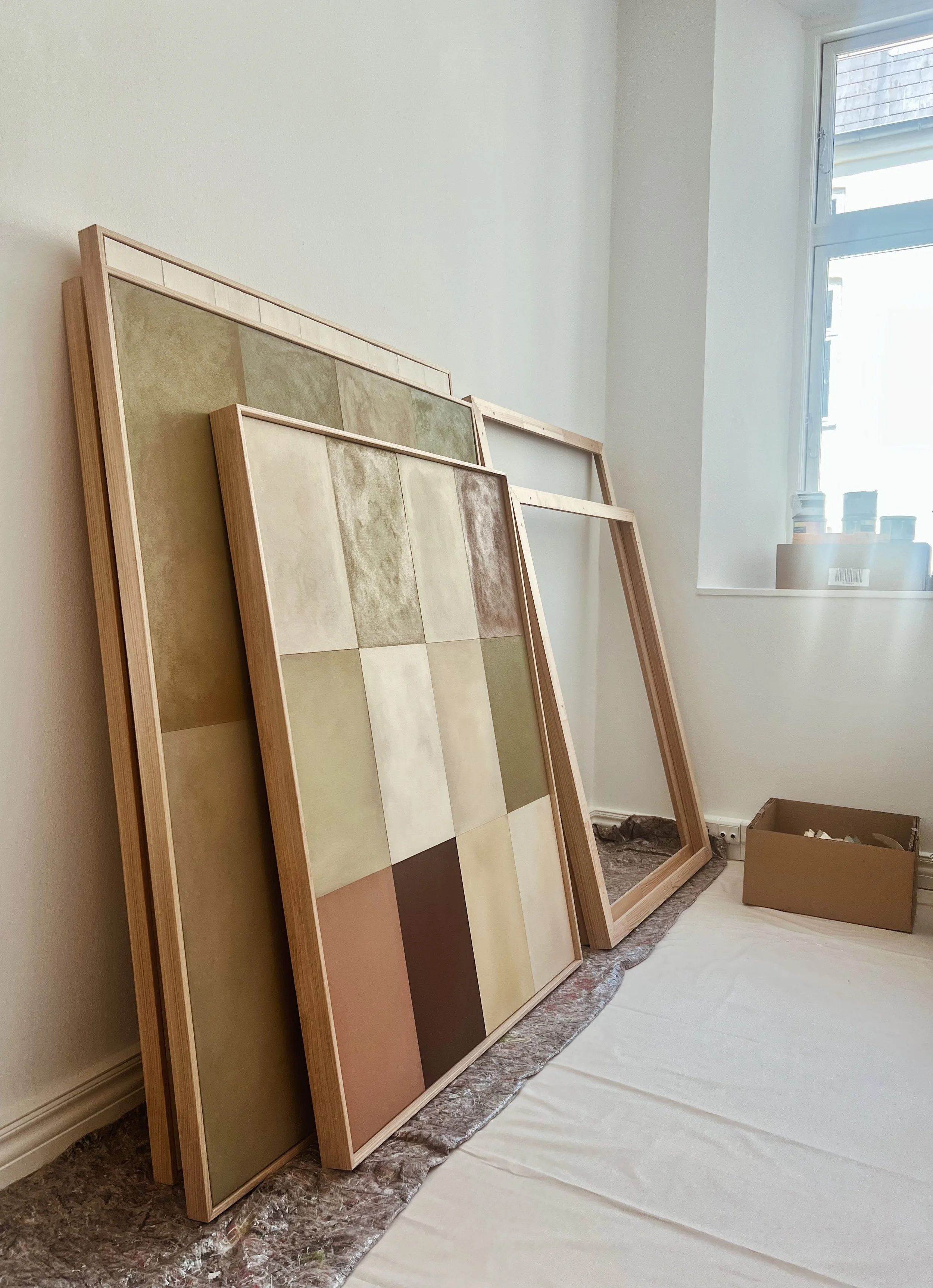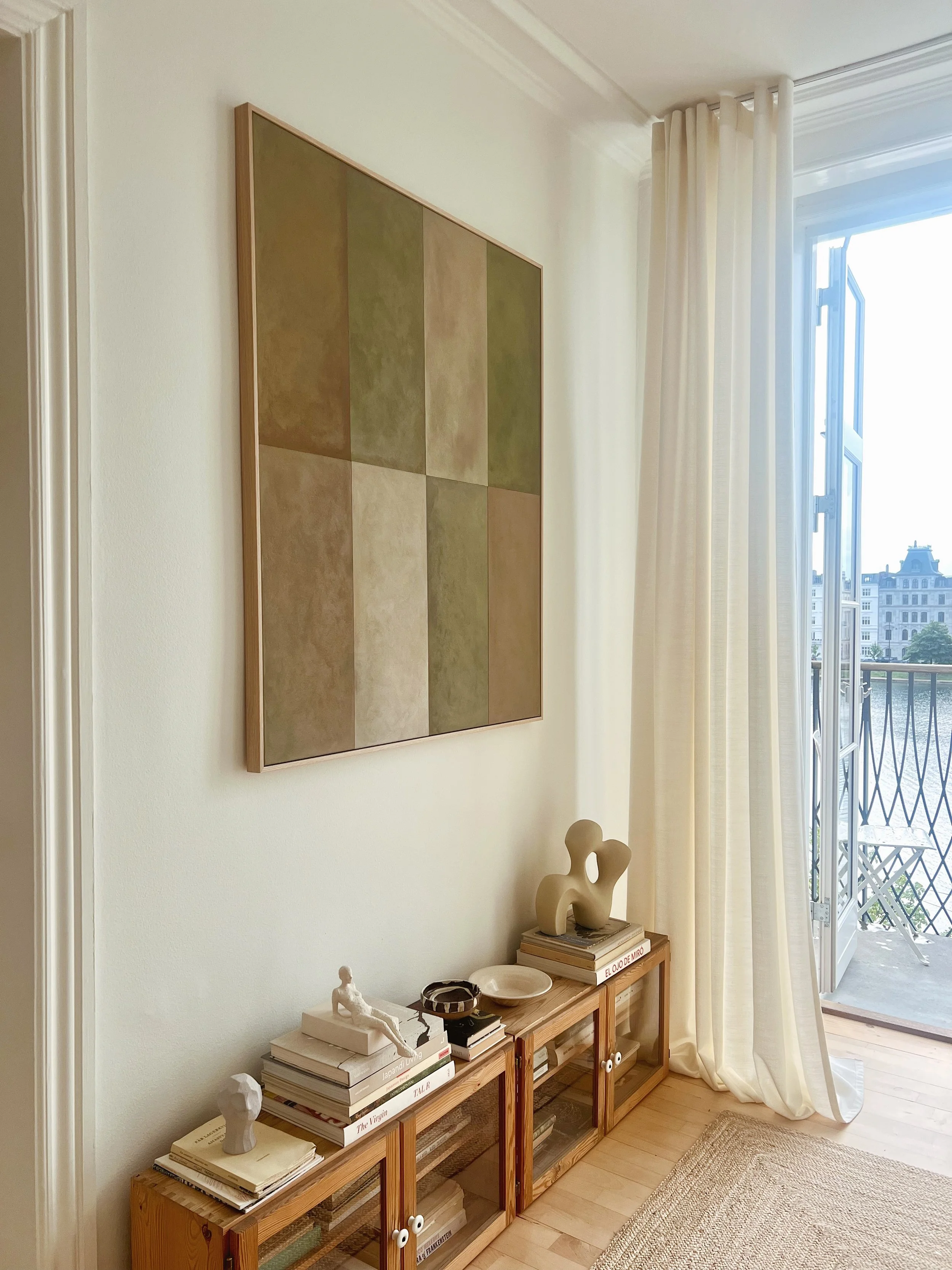 Below you can see some of my latest works up close, within interior or in contrast to each other. The latest release consists of three series. The one I never tire from and that keeps evolving almost invisibly, the series ‘Patches’. And a new exploration of color in the series ‘Originals’, where each square is a field of focus, shadow and depth and small ‘flaws’ are the hidden gems. Like humans they may appear similar, but all the many layers of different paints add a certain unique feel to every single one. As a little new series, there are two smaller works called ‘Cover Up’. Inspired by my love for old patinated books and especially a deep curiosity to how the covers look beneath the paper binding, I have tried to bring out a sense of an old cover on these chunky canvasses painted as if they had years behind them and might hide a lot of stories underneath the ‘Cover Up’.